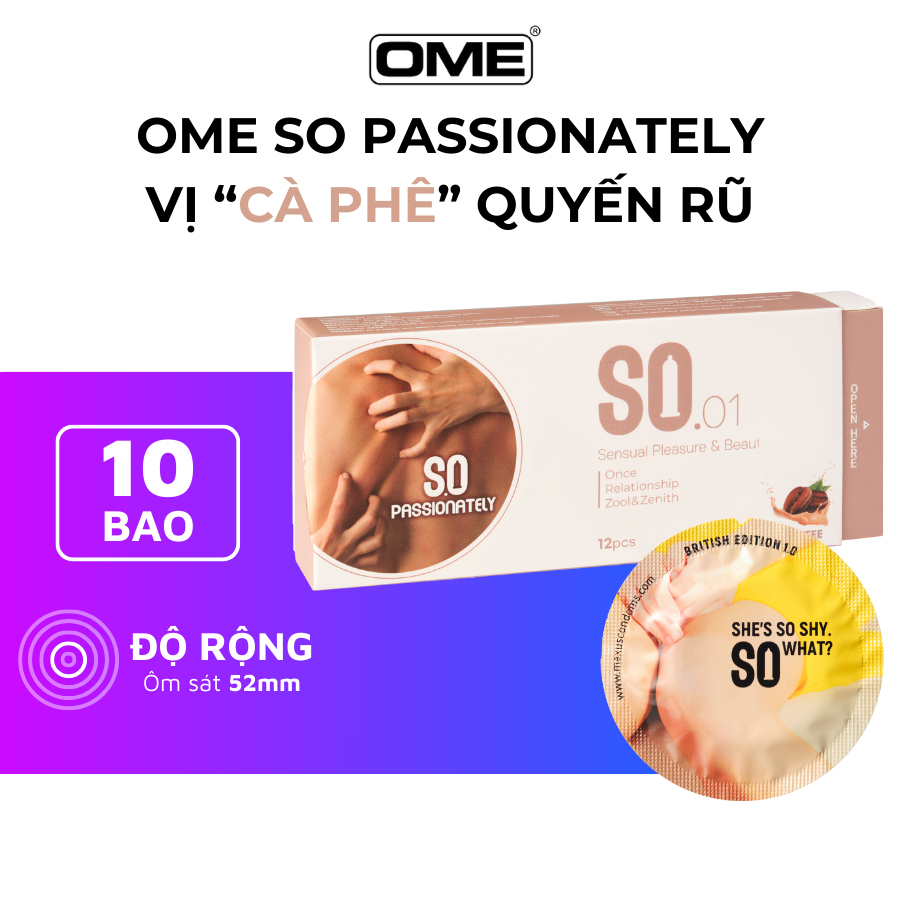 - Bao cao su SO PASSIONATELY SIÊU MỎNG, HƯƠNG COFFEE - HỘP 12 với đường kính 52mm, có thêm chất kéo dài, tăng cường thời gian quan hệ, bên trong bcs chứa nhiều gel bôi trơn và tăng độ cứng cáp giúp bạn điều khiển được cuộc yêu như ý muốn.