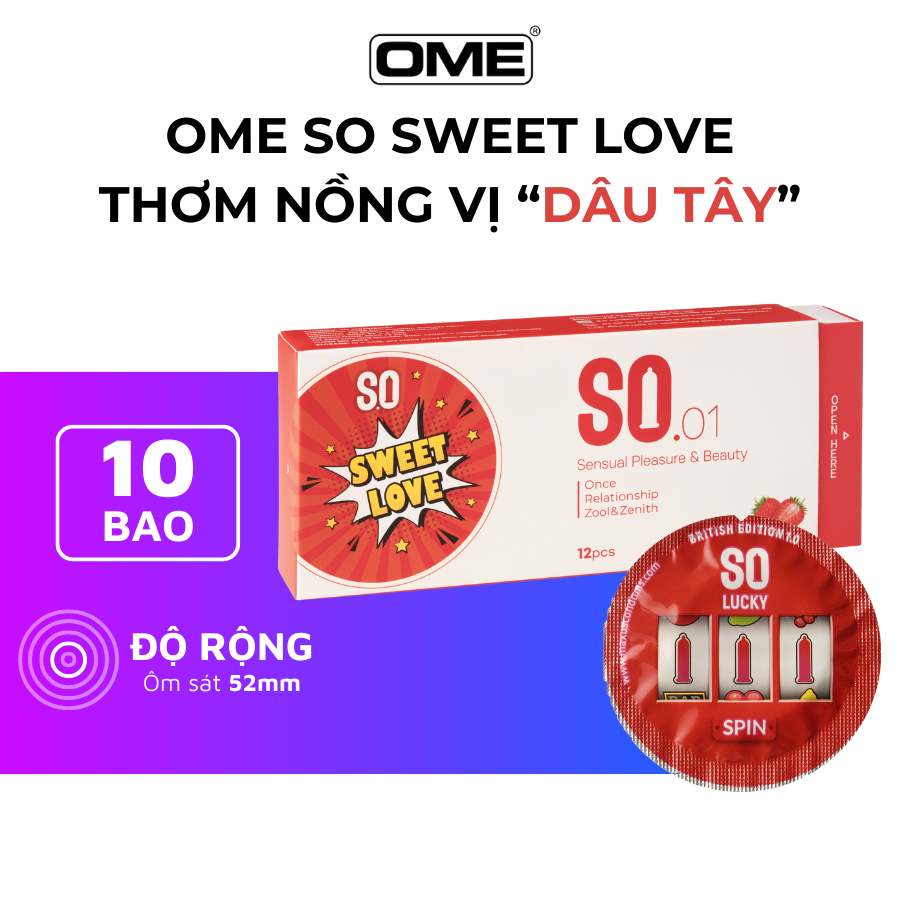 Bao cao su SO SWEET LOVE size 52mm siêu mỏng, hương dâu 12 cái/ hộp